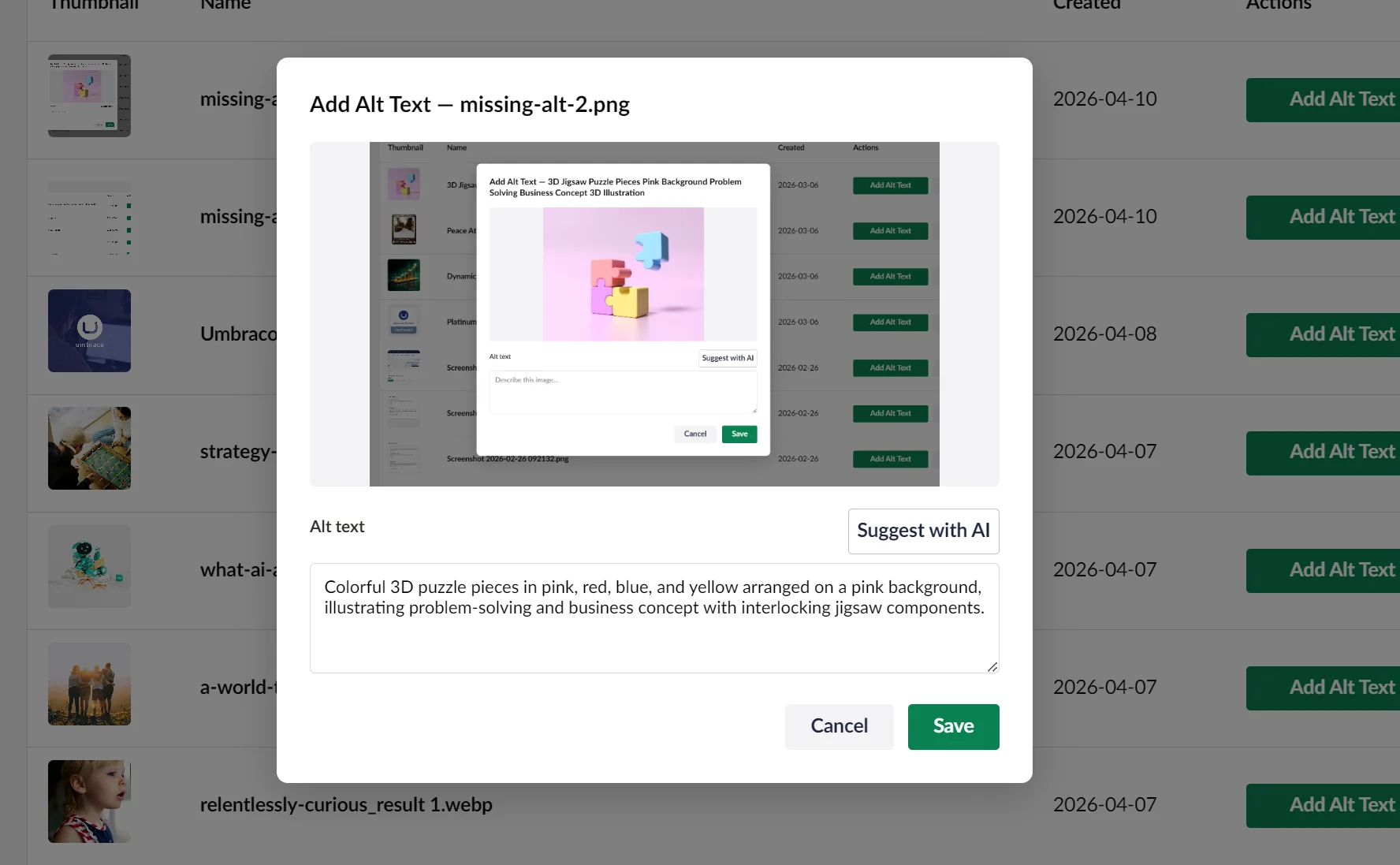 The Missing Alt Text Dashboard helps you quickly find missing Alt tags, review, populate or get AI to do the heavy lifting for you.